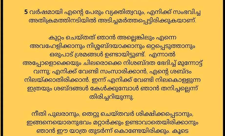 അഞ്ച് വര്ഷമായി എന്റെ പേരും വ്യക്തിത്വവും എനിക്ക് സംഭവിച്ച അതിക്രമത്തിനടിയില് അടിച്ചമര്ത്തപ്പെട്ടിരിക്കുകയാണ്. കുറ്റം ചെയ്തത് ഞാന് അല്ലെങ്കിലും എന്നെഅവഹേളിക്കാനും നിശ്ശബ്ദയാക്കാനും ഒറ്റപ്പെടുത്താനും ഒരുപാട് ശ്രമങ്ങള് ഉണ്ടായിട്ടുണ്ട്. എന്നാല് അപ്പോളൊക്കെയും ചിലരൊക്കെ നിശബ്ദത ഭേദിച്ച് മുന്നോട്ട് വന്നു. എനിക്ക് വേണ്ടി സംസാരിക്കാന് എന്റെ ശബ്ദം നിലക്കാതിരിക്കാന് ഇന്ന് എനിക്ക് വേണ്ടി നിലകൊള്ളുന്ന ഇത്രയും ശബ്ദങ്ങള് കേള്ക്കുമ്ബോള് ഞാന് തനിച്ചല്ലെന്ന്തിരിച്ചറിയുന്നു.